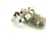 - Kolczyki wykonałam ręcznie pracochłonną techniką wire-wrapping, wykorzystałam: selenit (Afryka Południowa) kule 8 mm i 4 mm, drut mosiężny (gatunek: M63; stop 62-64% miedzi i 36-38% cynku), mosiężne bigle pokryte prawdziwym 18K złotem, mosiężne kulki o średnicy 2.4 mm oraz silikonowe baranki